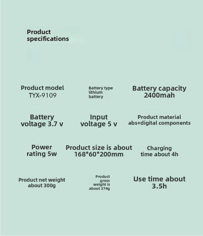 | Battery capacity | :2400mAh18650 lithium battery | dimensions (l x w x h (inches) | 16.8*6*20cm(6.61*2.36*7.87in) |